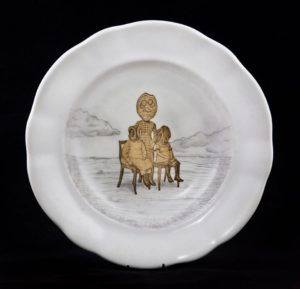 “The scenes, people and landscapes on plates we recognize as on the border between the poetic, ironic, dramatic or humorous. Albeit they are leaving an impression as if they were from an unknown or at least a distant world / time, they in fact can often be identified as already known, or the like characters, but we still remain in the gap in between deciphering and understanding what’s really going on.” writes J. Vukmir in the catalogue foreword.