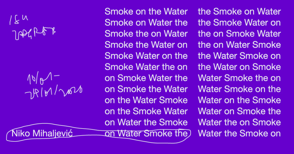 “on Water Smoke the” je zvučna kompozicija Nike Mihaljevića inspirirana permutacijskom poezijom Briona Gysina i glazbom hard rock sastava Deep Purple. Sastoji od svih mogućih permutacija 12 tonova glavne gitarske dionice pjesme “Smoke on the Water”. Budući da postoji 479 001 600 permutacija od kojih svaka traje oko osam sekundi, trajanje kompozicije iznosi 130 godina i 13 dana. Prva javna izvedba započeti će u petak 10. 01. 2020., a završit će se u subotu 24. 01. 2150.