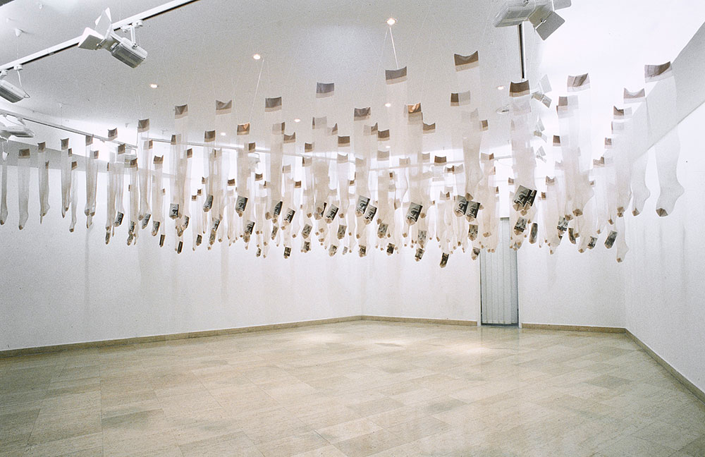 …žena je žena je žena je…, 1997. ambijent izveden od 200 najlon čarapa i c/b fotografija sa ili bez aplikacija Galerija Miroslav Kraljević …žena je žena je žena je… 10. – 28. 3. 1997. 1997.
