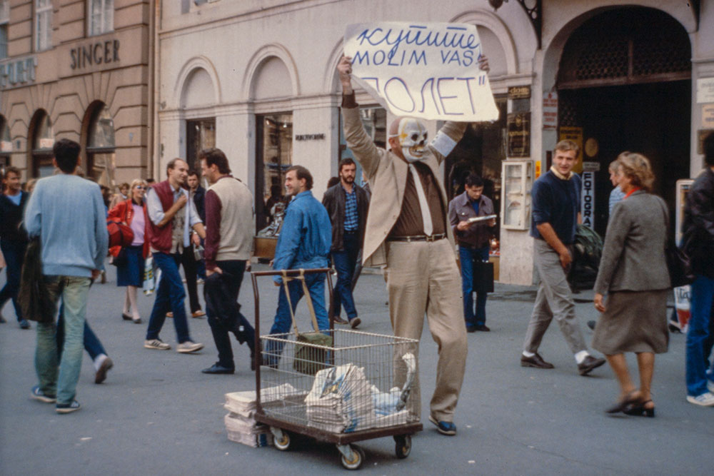 Kolpoter “Poleta”, s mrtvačkom maskom, 1985./86. performans Trg Republike (danas: Trg bana Jelačića), Zagreb 1985./86.