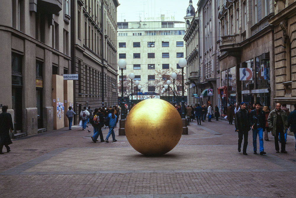 Prizemljeno sunce / The landed sun, 1971./1994. skulptura u javnom prostoru, bronca, zlatni listići, promjer: Bogovićeva ulica, Zagreb