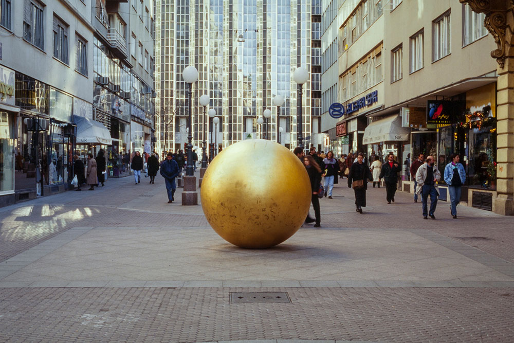 Prizemljeno sunce / The landed sun, 1971./1994. skulptura u javnom prostoru, bronca, zlatni listići, promjer: Bogovićeva ulica, Zagreb