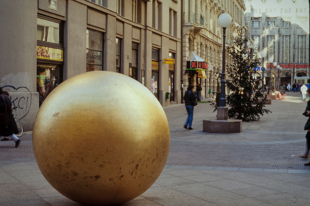 Prizemljeno sunce / The landed sun, 1971./1994. skulptura u javnom prostoru, bronca, zlatni listići, promjer: Bogovićeva ulica, Zagreb