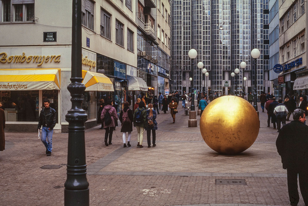 Prizemljeno sunce / The landed sun, 1971./1994. skulptura u javnom prostoru, bronca, zlatni listići, promjer: Bogovićeva ulica, Zagreb