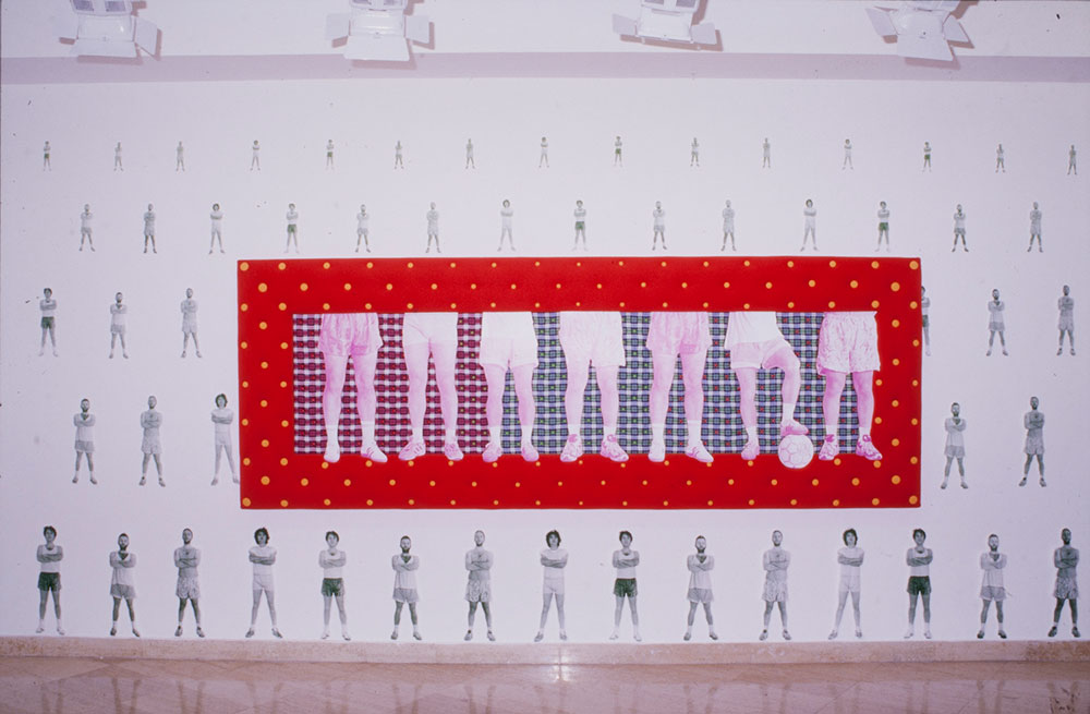 Football Dream Team, 1997. kombinirana tehnika ( serigrafija na drvui tekstilu, drvena konstrukcija, spužva, tekstil, dugmad…), 117 X 320 X 20 cm Galerija Miroslav Kraljević 1997.