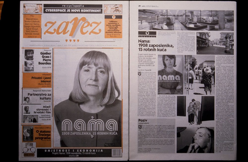 NAMA – 1908 zaposlenika, 15 robnih kuća / NAMA: 1908 employees, 15 department stores, 2000. naslovnica ćasopisa Zarez, 8. 6. 2000. i članak na stranici 20 Dom HDLU NAMA – 1908 zaposlenika, 15 robnih kuća / NAMA: 1908 employees, 15 department stores 16. 6. – 10. 7. 2000.