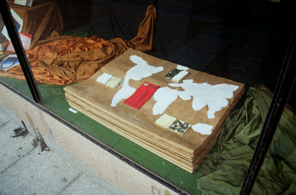 Zemlja je ravna ploča, 1996. instalacija: natron papir, metalne kutije, tablete, lijekovi, tkanina, akrilik, šiljila, olovke, gumice za brisanje; 13 X 90 X 66 cm izlog Mladosti na Cvetnom trgu, Zagreb T’est 19. – 28. 4. 1996