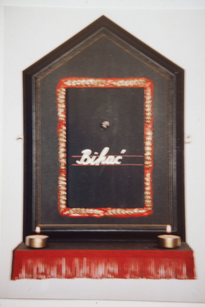 Untitled / Bez naziva, 1993 mixed media on bord, (book with a bullet hole, wheat, acrylic, candles, fabric) / mixed media na ploči (knjiga sa rupom od metka, žito, akril, svijeće, tkanina), 44 X 31 cm