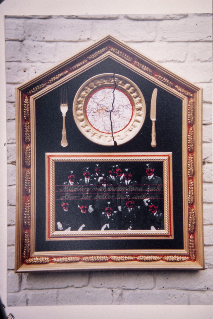 Untitled / Bez naziva, 1994 mixed media on bord (wheat, acrylic, utensils, ceramic, photo, glass) / mixed media na ploći (žito, akril, nož i vilica, keramika, fotografija, staklo) 86 X 68 cm